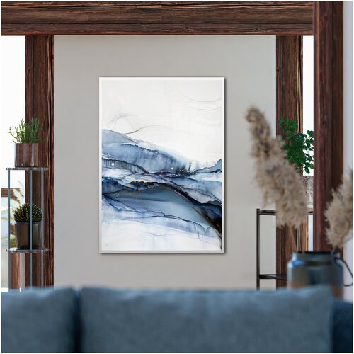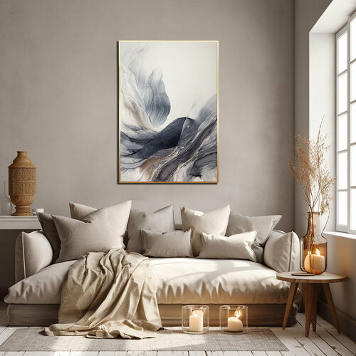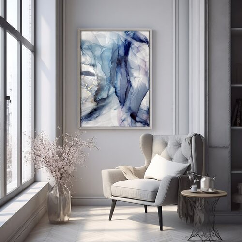 Большая картина-оригинал 1 м — серо-синяя абстракция с золотом 70х100 см акварельный флюид-арт спиртовыми чернилами – Китовая I