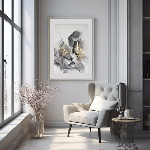 Картина-оригинал — чёрно-белая картина-абстракция для интерьера мрамор с золотом 50х70 см флюид-арт спиртовыми чернилами – Мраморный флюид III