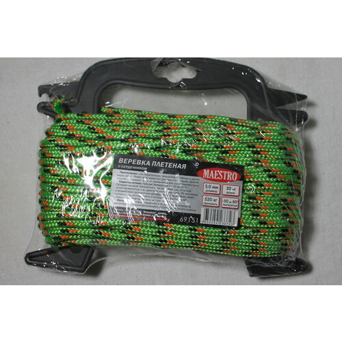 Веревка плетеная с сердечником 5 мм х 20 м, неон с черной, оранжевой нитями, м/рамка