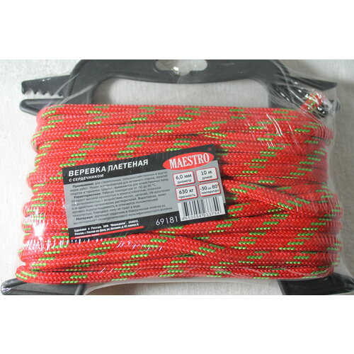 Веревка плетеная с сердечником 6 мм х 10 м, красная с нитью неон, м/рамка