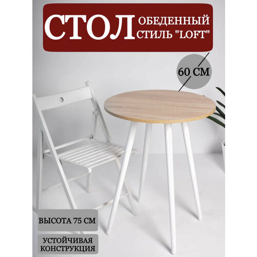 Стол кухонный лофт обеденнный круглый, белый, подстолье - ножки дерево "Белый", ЛДСП цвет "Дуб сонома" 60х75 см