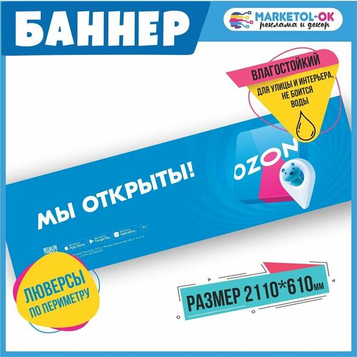 Рекламный плакат для ПВЗ озон, вывеска, баннерная растяжка OZON, баннер с люверсами "Мы открыты" для пункта выдачи озон. Размер 2110*610мм