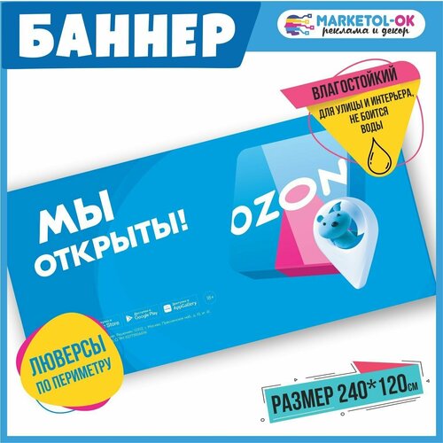 Рекламный плакат для ПВЗ озон, вывеска, баннерная растяжка OZON, баннер с люверсами "Мы открыты" для пункта выдачи озон. Размер 2400*1200мм