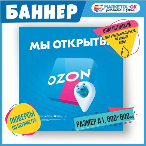 Рекламный плакат для ПВЗ озон, вывеска, баннерная растяжка OZON, баннер с люверсами "Мы открыты" для пункта выдачи озон. Размер 600*600мм