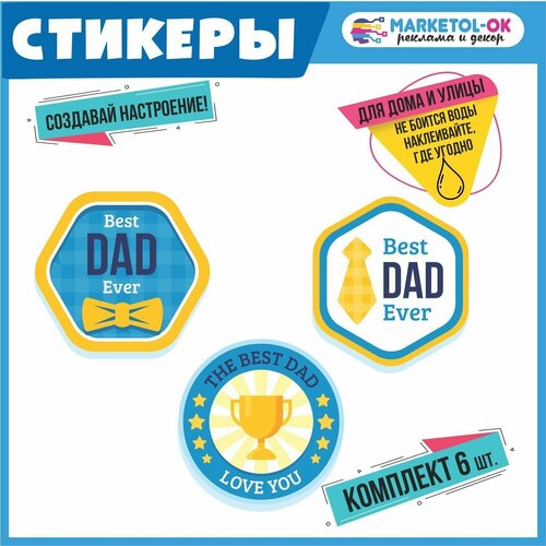 Праздничные стикеры "Best dad ever!" можно клеить на любую поверхность, влагостойкие. Наклейки для праздника MARKETOL-OK, набор 6 штук.