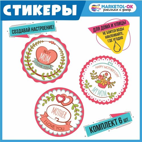 Праздничные стикеры "I love MOM!" на день рождения. Наклейки для праздника MARKETOL-OK, набор 6 штук.