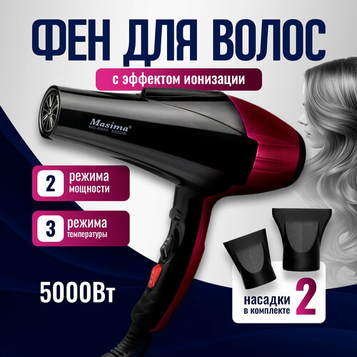Фен для укладки волос локонов профессиональный с насадками с ионизацией мощный с холодным воздухом с регулировкой температуры черно-бордовый