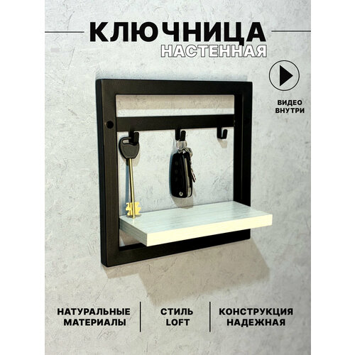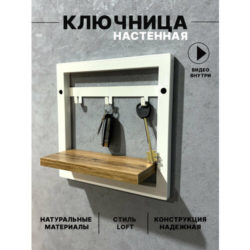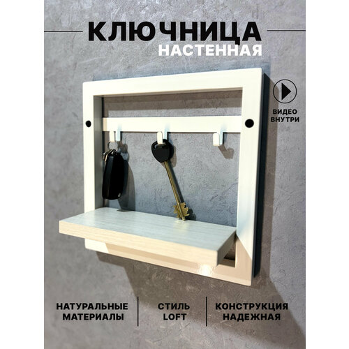 Ключница настенная с полочкой лофт MEBEL.VSTILE, 3 крючка вотан белый