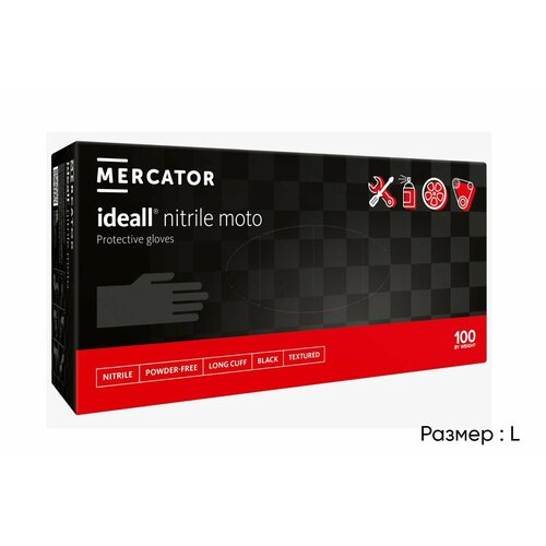 Перчатки сверхпрочные нитриловые удлиненные, размер L, ideall nitrile moto, Mercator / Меркатор, особо прочные, черные, 100 штук