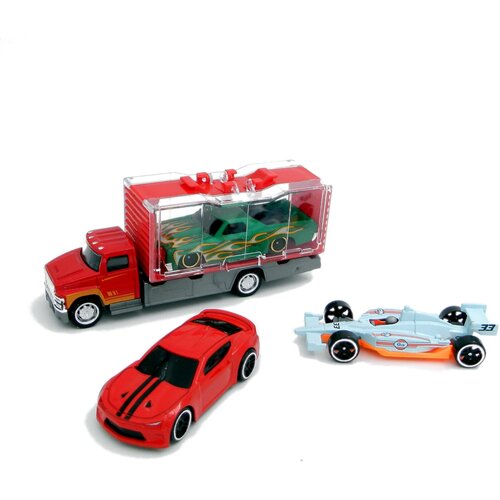Металлическая машинка 1:64. Die cast набор Красный грузовик с боксом и 3 базовых машинки. Подарок мальчику.