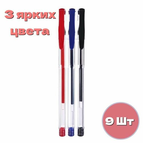 Набор гелевая ручка, 9 шт, 0.5 мм, 3 цвета (синий, красный, черный), с резиновым держателем