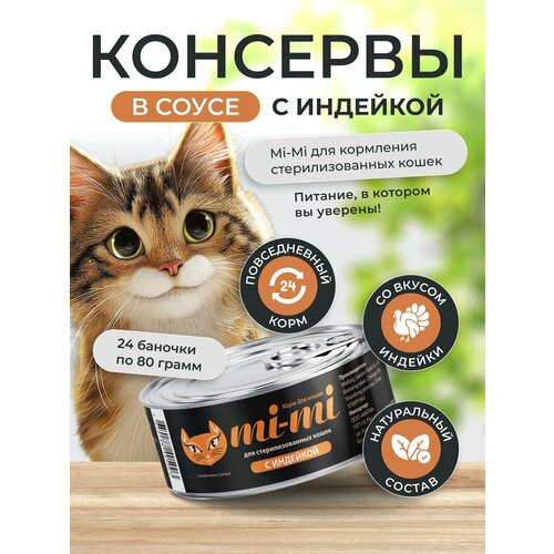 Консервы для стерилизованных кошек Mi-Mi с индейкой в соусе 80г, 24 шт, Китай