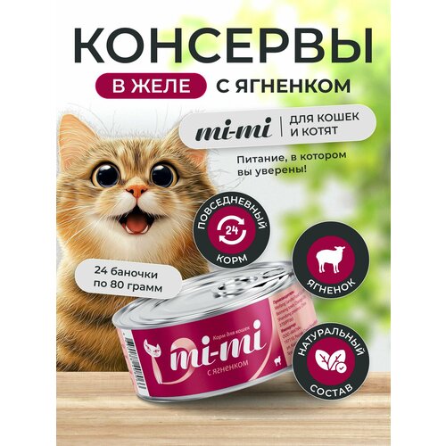 Консервы для кошек и котят Mi-Mi с Ягненком, кусочки в желе 80г, 24 шт.