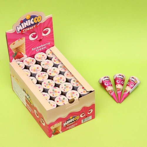 Изделия кондитерские сахаристые "Minicco" Вафельный рожок с клубничным и сливочным кремом и драже 100гр