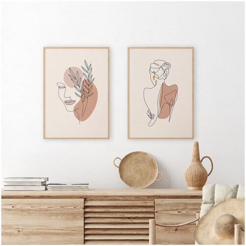 Набор интерьерных постеров "Девушка одной линией в стиле Бохо" 2 постера 30x40 см, картина на стену, идея для подарка.