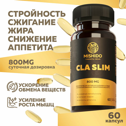 Жиросжигатель для похудения CLA SLIM MISHIDO 60 капсул Конъюгированная линолевая кислота (сафлоровое масло) 800 мг БАД для снижения веса, подавления аппетита, набора мышечной массы женщин и мужчин