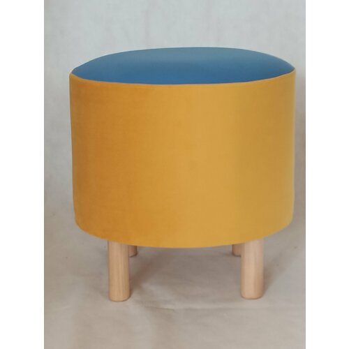 Пуф Круг, велюр ворсовый светло-синий, низ-жëлтый (горчичный) на деревянных ножках с подпятниками