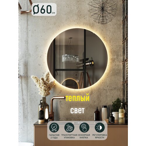 Зеркало для ванной с подсветкой FURIA 60х60 см теплый свет, зеркало настенное, интерьерное, для макияжа OMEGA GLASS