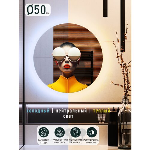 Зеркало для ванной с подсветкой FURIA 50х50 см 3в1, зеркало настенное, интерьерное, для макияжа OMEGA GLASS