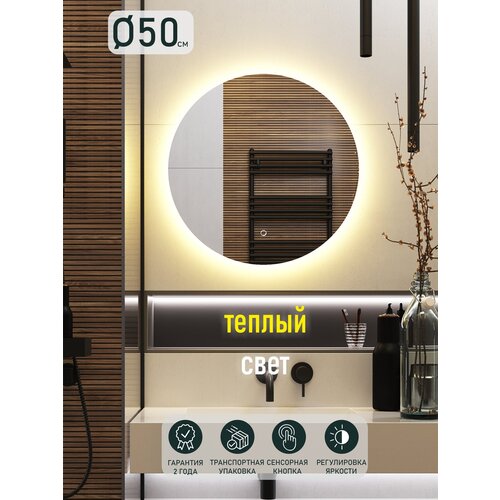 Зеркало для ванной с подсветкой FURIA 50х50 см теплый свет , зеркало настенное, интерьерное, для макияжа OMEGA GLASS