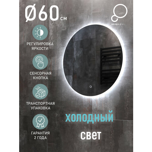 Зеркало для ванной с подсветкой FURIA 60х60 см холодный свет, зеркало настенное, интерьерное, для макияжа OMEGA GLASS