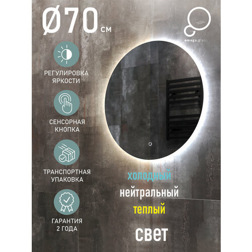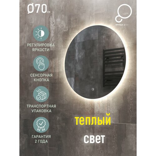 Зеркало для ванной с подсветкой FURIA 70х70 см теплый свет, зеркало настенное, интерьерное, для макияжа OMEGA GLASS
