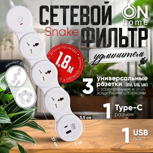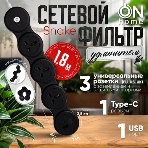 Сетевой фильтр удлинитель ON Home Snake с тремя универсальными розетками, USB, TYPE-C, 1.8 м