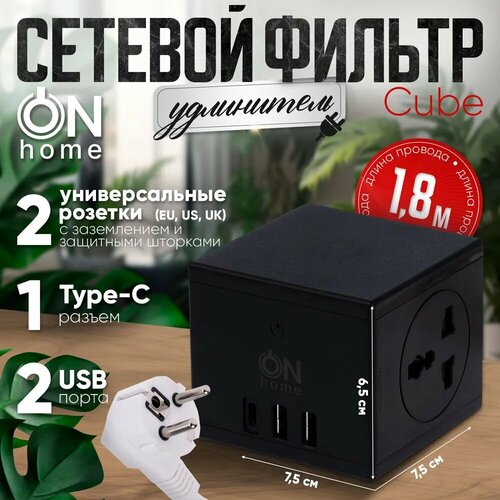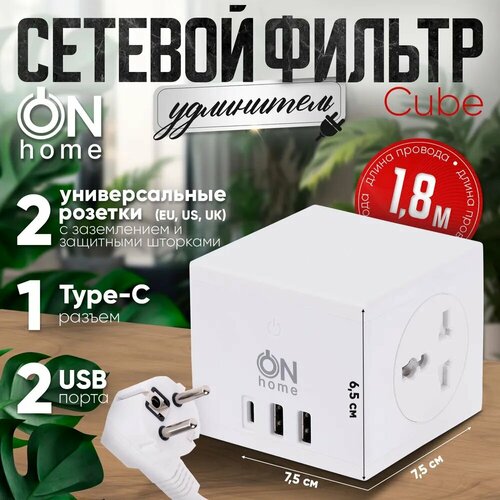 Сетевой фильтр удлинитель ON Home Cube с двумя универсальными розетками, USB, TYPE-C, 1.8 м