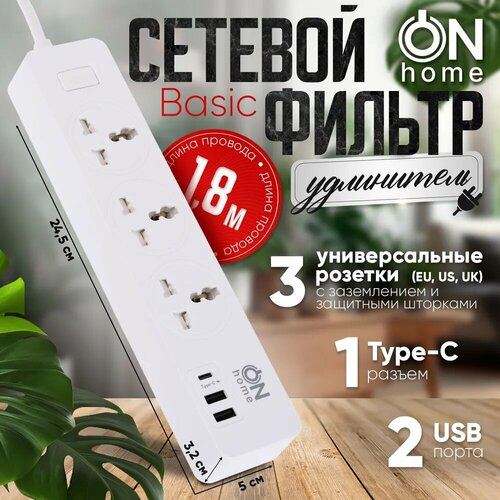 Сетевой фильтр удлинитель ON Home Basic с тремя универсальными розетками, USB, TYPE-C, 1.8 м