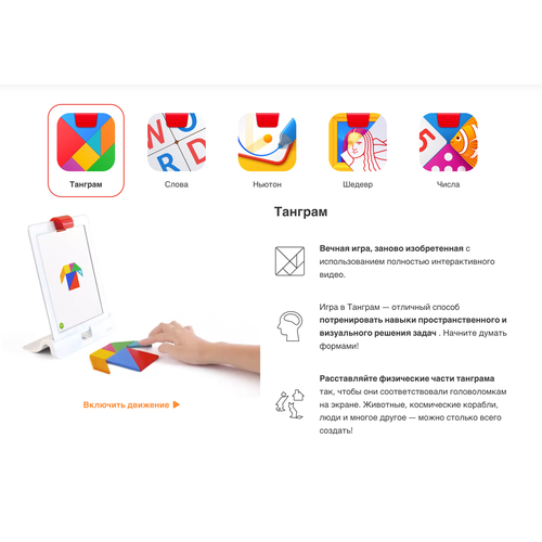 Бренд OSMO - это инновационная компания, специализирующаяся на разработке и производстве продуктов для обучения и развития детей. Они создают интерактивные игры и образовательные приложения, которые объединяют физические и цифровые компоненты, чтобы помочь детям активно учиться и развиваться. Основной концепцией OSMO является использование устройств iPad, которые взаимодействуют с физическими объектами и позволяют детям учиться через игру. Бренд OSMO получил широкое признание и награды за свои инновационные продукты, которые помогают развивать навыки логического мышления, креативности и проблемного мышления у детей. Они предлагают разнообразные игры и задания, которые подходят для различных возрастных групп и помогают развить различные навыки и умения. Каждый продукт OSMO разработан с учетом педагогических принципов и обеспечивает интересные и захватывающие игровые ситуации для детей.