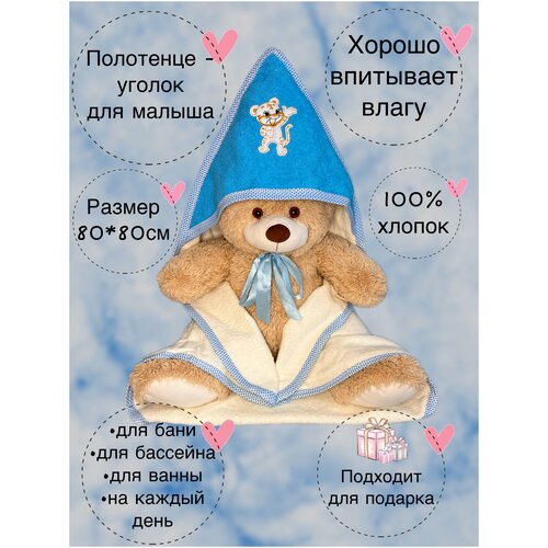 Полотенце для новорожденного с уголком с вышивкой, Хлопок, детское махровое полотенце 80 х 80 см, кремово-голубой.