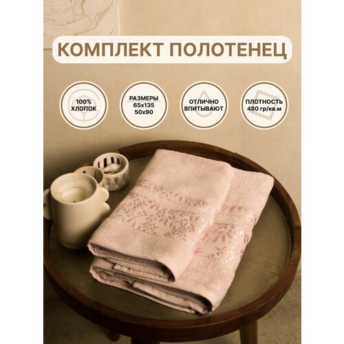 Набор махровых полотенец Parisa Home для ванной, для лица и рук, 100%-й хлопок, 50х90 и 65х135 см, пудровый, 2шт