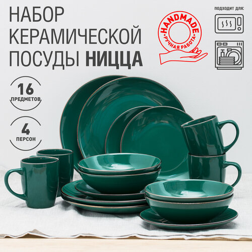 Столовый сервиз для кухни керамический на 4 персоны "Ницца", набор из 16 предметов с кружками для напитков