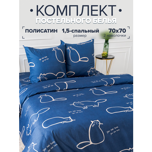 Комплект постельного белья Павлина 1955 Коты на синем 1,5 спальный, Полисатин, наволочки 70x70