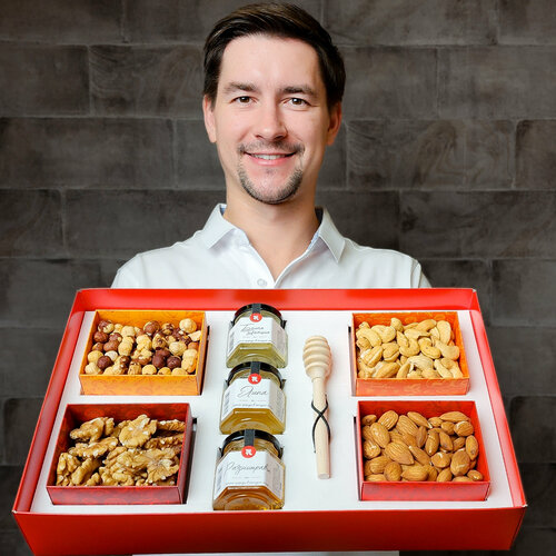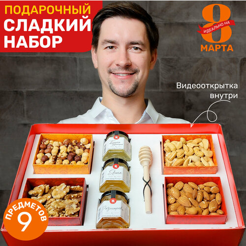 Подарочный набор орехов и меда RAKITIN GIFTS, чайный набор для женщин и мужчин на день рождения, сладкий бокс с видеооткрыткой