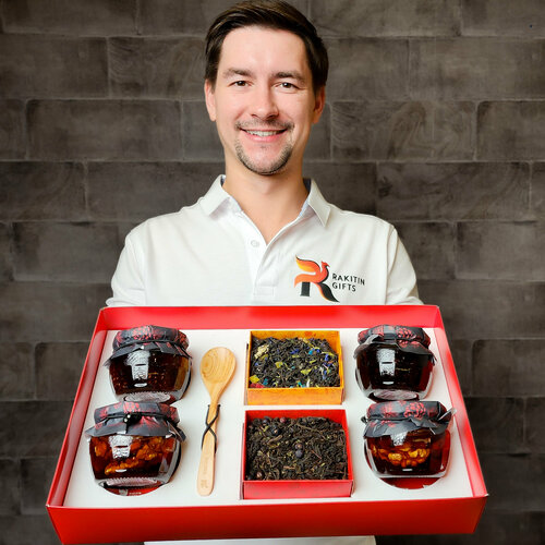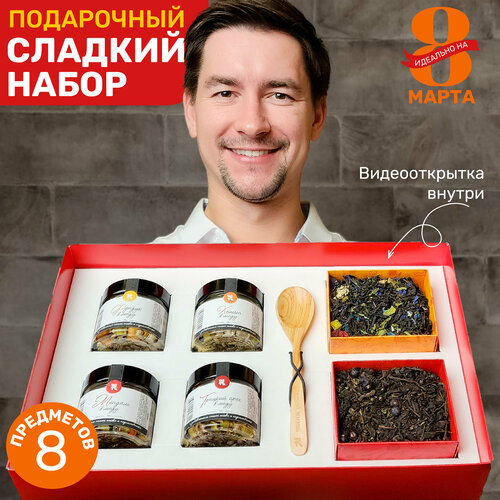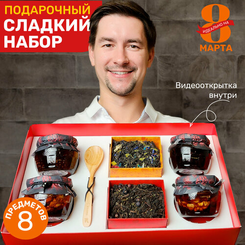 Подарочный набор чая и варенья RAKITIN GIFTS, сладкий чайный бокс на день рождения, сюрприз бокс с видеооткрыткой женщине и мужчине / сладкие подарки