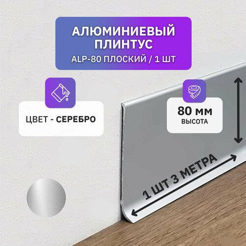 Плинтус напольный плоский алюминиевый 3 метра, 80 мм высотой, серебро, 1шт