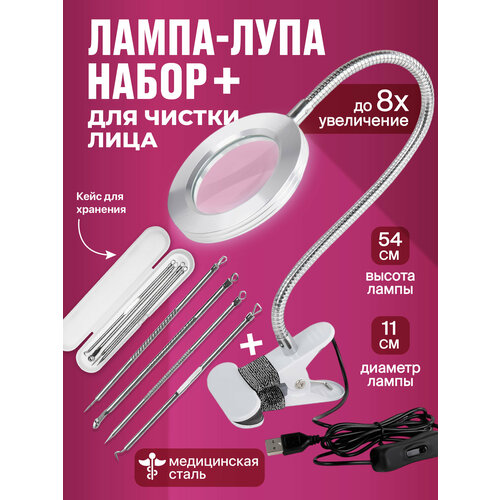 Лампа лупа с подсветкой настольная, набор инструментов для чистки лица REVOLUT