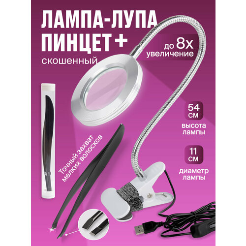 Лампа лупа с подсветкой настольная, изогнутый пинцет для бровей и ресниц REVOLUT