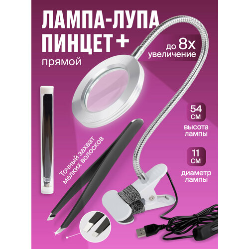 Лампа лупа с подсветкой настольная, прямой пинцет для бровей и ресниц REVOLUT