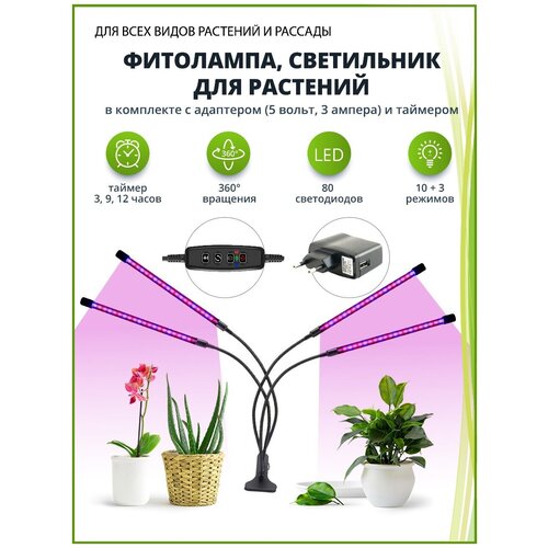 Фитолампа на прищепке 4 лампы, Растительный светильник R-Led 4 лепестка, для рассады USB + адаптер