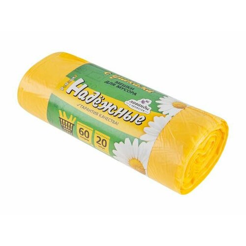 Мешки для мусора с ушками, 60 л, 20 шт, "надежные", желтые, ромашка (60х74см/15мкм) (ВЛ07020У)