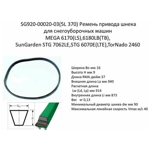 Ремень привода шнека 5L 370 для снегоуборщиков Profi ST6560T1E/6560ES; Tornado 2460/2465; MEGA MTG6170/6180/7062LE; SUNGARDEN STG6070/7062