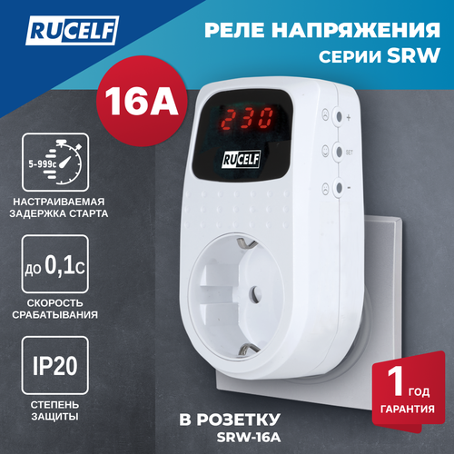 Реле напряжения Rucelf SRW-16A, для защиты бытовой техники, с дисплеем, задержка старта.