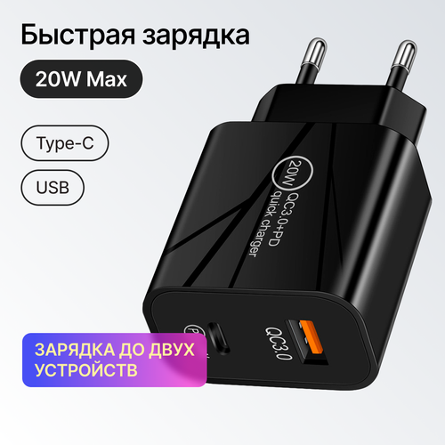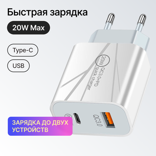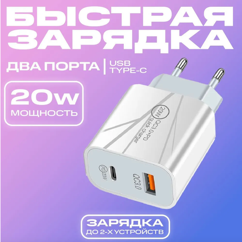 Зарядное устройство для телефона с быстрой зарядкой Type-C / USB 20W на 2 порта