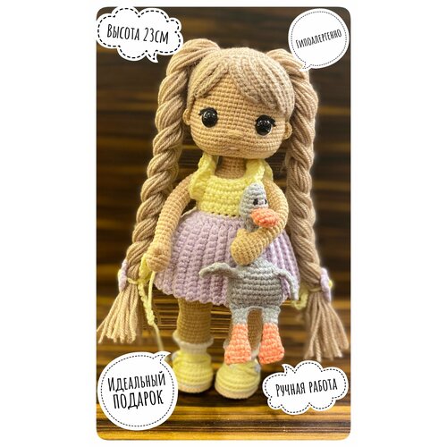 Игрушка мягкая детская вязаная ручной работы 21см + 21см ушки "Зайка в платье" желтый