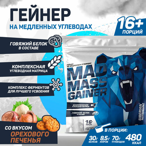 Siberian Nutrogunz Mad mass gainer 2000 g (Ореховое печенье), Гейнер, Для набора массы, Для роста мышц, 2000 грамм