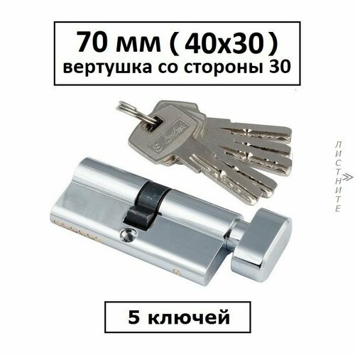 Личинка замка 70 мм (40х30) с вертушкой со стороны 30 и перфоключами хром цилиндровый механизм S-Locked 402B Standart