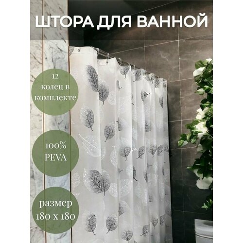 Штора для ванной комнаты 180х180 см Stt белая с листьями / Шторка для ванной комнаты и душа 180 см на 180 см / Кольца в комплекте / Материал PEVA