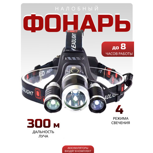 Фонарь налобный аккумуляторный мощный с регулировкой угла и с тремя интегрированными фонарями